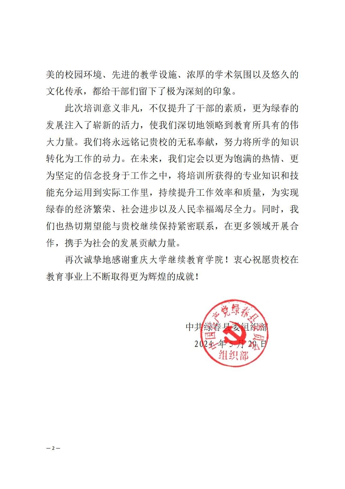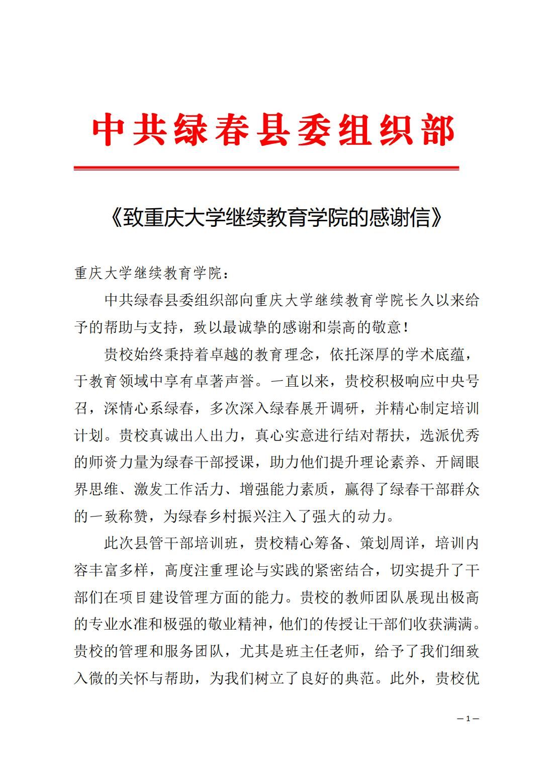 4月16日-4月24日,基层干部项目建设管理能力提升专题培训班在继续教育学院成功举办。培训期间,学院教职员工以因班制宜的筹划安排,匠心独运的课程设置,周到细致的培训服务,展现了重大人的良好风貌,让培训学员满载而归。培训结束后,中共绿春县委组织部发来感谢信。