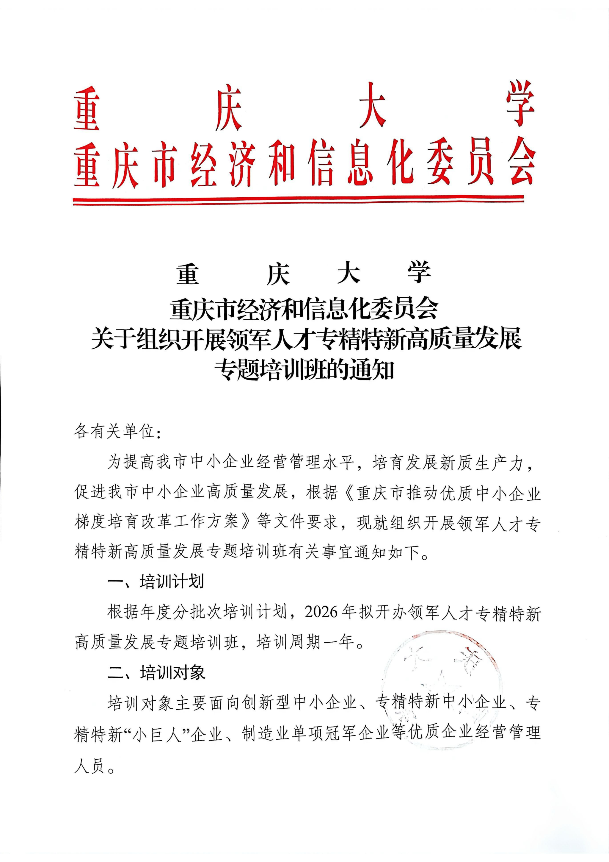 关于组织开展领军人才专精特新高质量发展专题培训班的通知