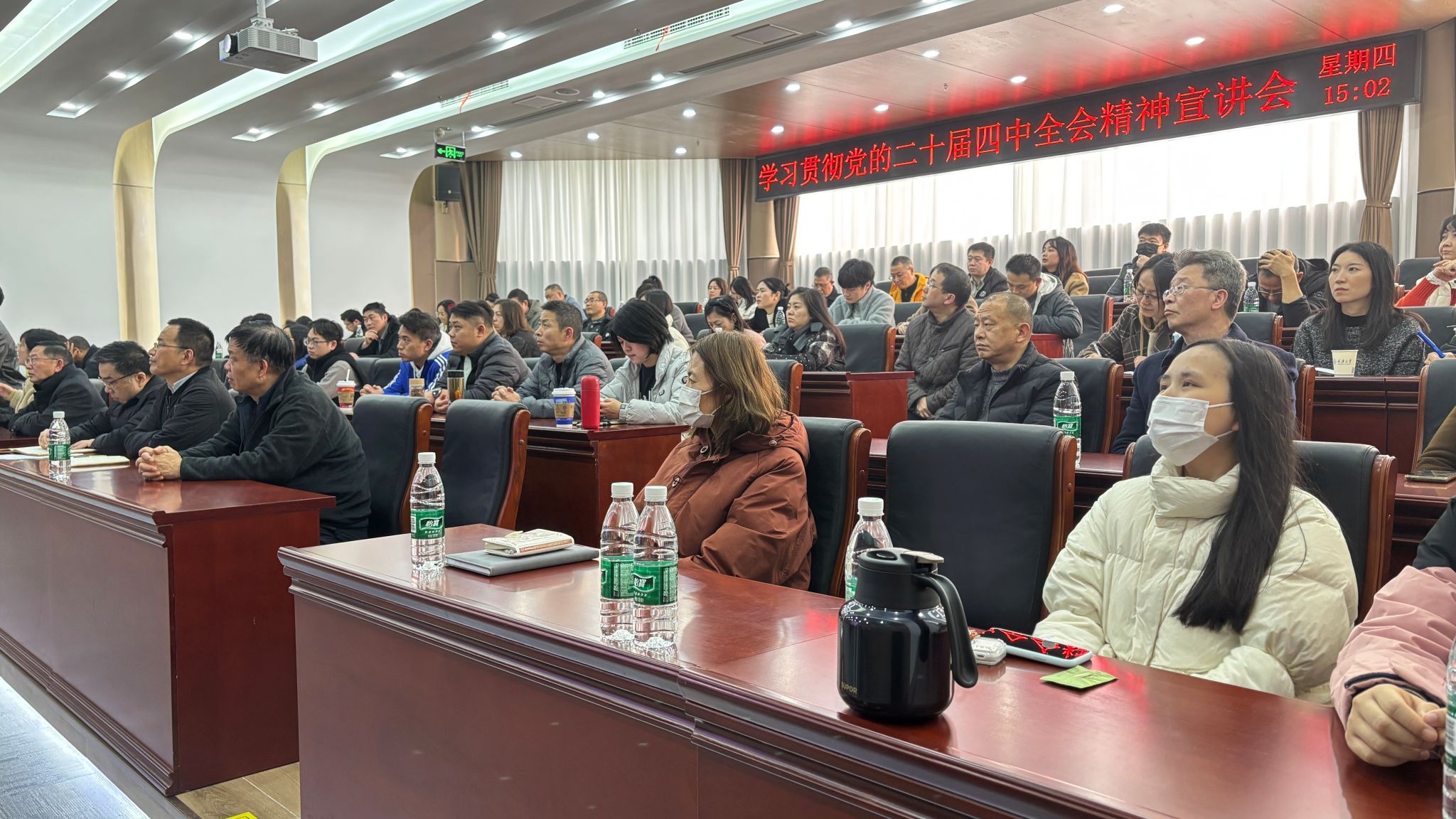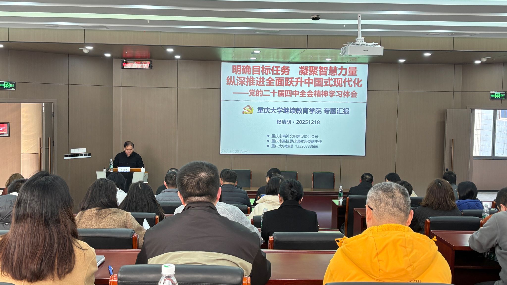 为深入学习贯彻党的二十届四中全会精神,切实把广大党员干部群众的思想和行动统一到党中央决策部署上来,12月18日,我院开展了学习贯彻党的二十届四中全会精神宣讲会。重庆市精神文明建设协会会长、重庆市高校思政课教资委副主任、重庆大学教授杨清明受邀出席,以《明确目标任务 凝聚智慧力量 纵深推进全面跃升中国式现代化》为题,为全体教职工作专题授课,带领大家深入学习贯彻党的二十届四中全会精神,进一步提高履职本领,强化使命担当。继续教育学院、网络教育学院党委书记谢心灵主持本次会议。